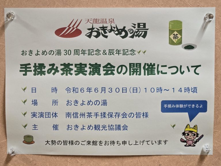 6月30日(日)午前10時00分から午後2時頃まで、南信州茶手揉保存会の皆様をおきよめの湯にお迎えし手揉み茶の実演会を開催いたします。