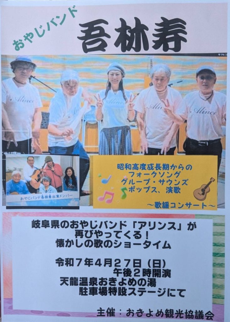 吾林寿(アリンス)のバンド演奏とおきよめの湯の温泉をご堪能いただければと思います。