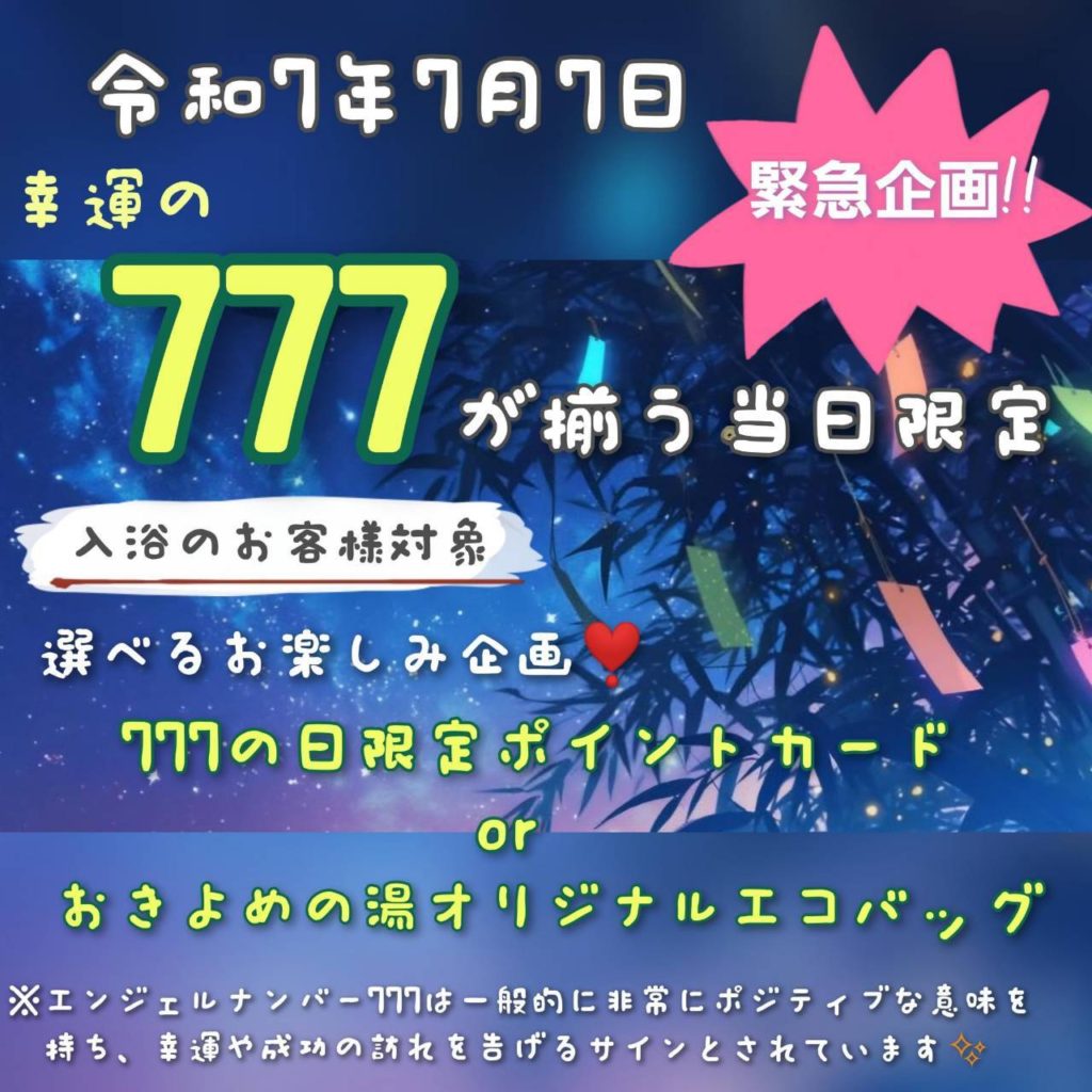 おきよめの湯では、令和7年7月7日(777)の記念日にあわせ、当日ご来館(ご入浴)いただいたお客様を対象に