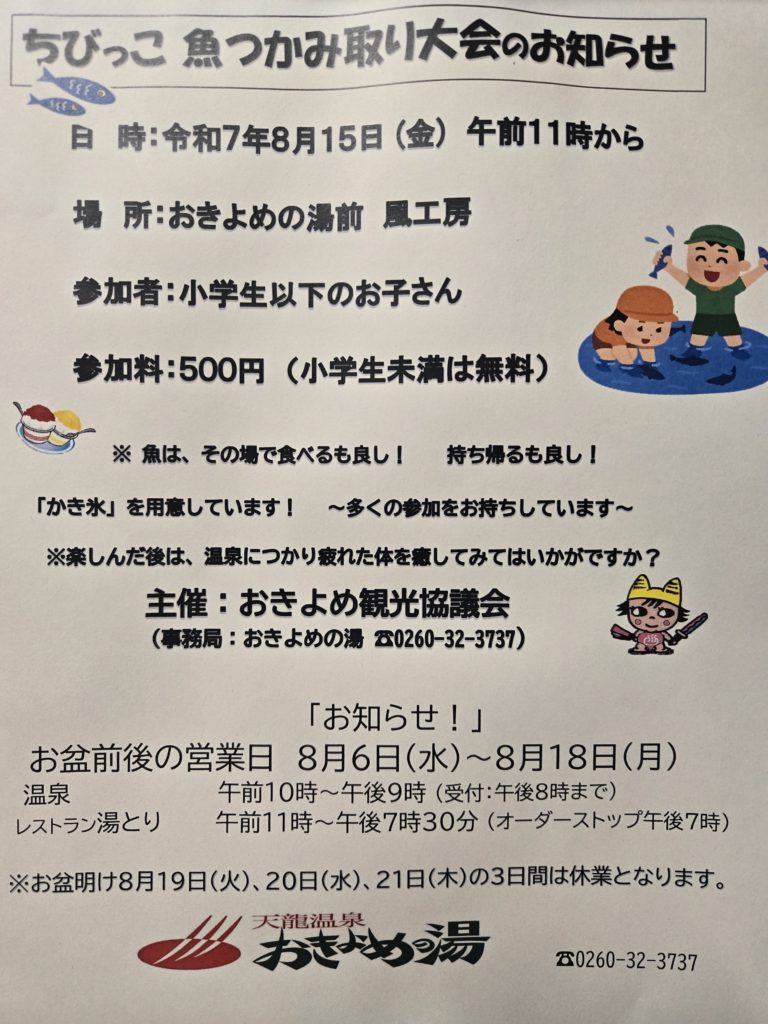今回は、8月15日(金)に開催予定のおきよめ観光協議会主催「ちびっこ魚つかみ取り大会」についてお知らせします。