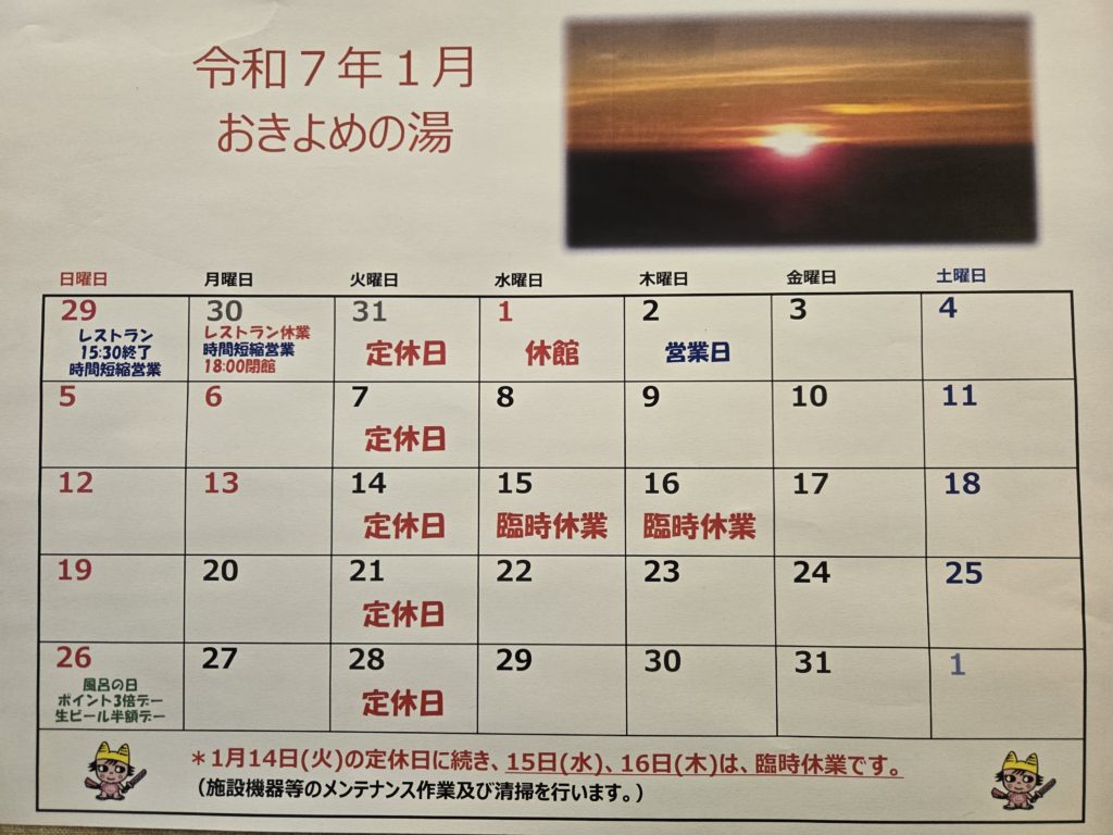 また、1月の休業日は毎週火曜日の定休日に加え、15日(水)16日(木)が設備のメンテナンスのため休業となりますのでご承知ください。