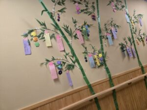 今回は、7月7日の七夕にあわせ、昨年も好評をいただきました手作りの七夕笹を館内の通路に設置しました。