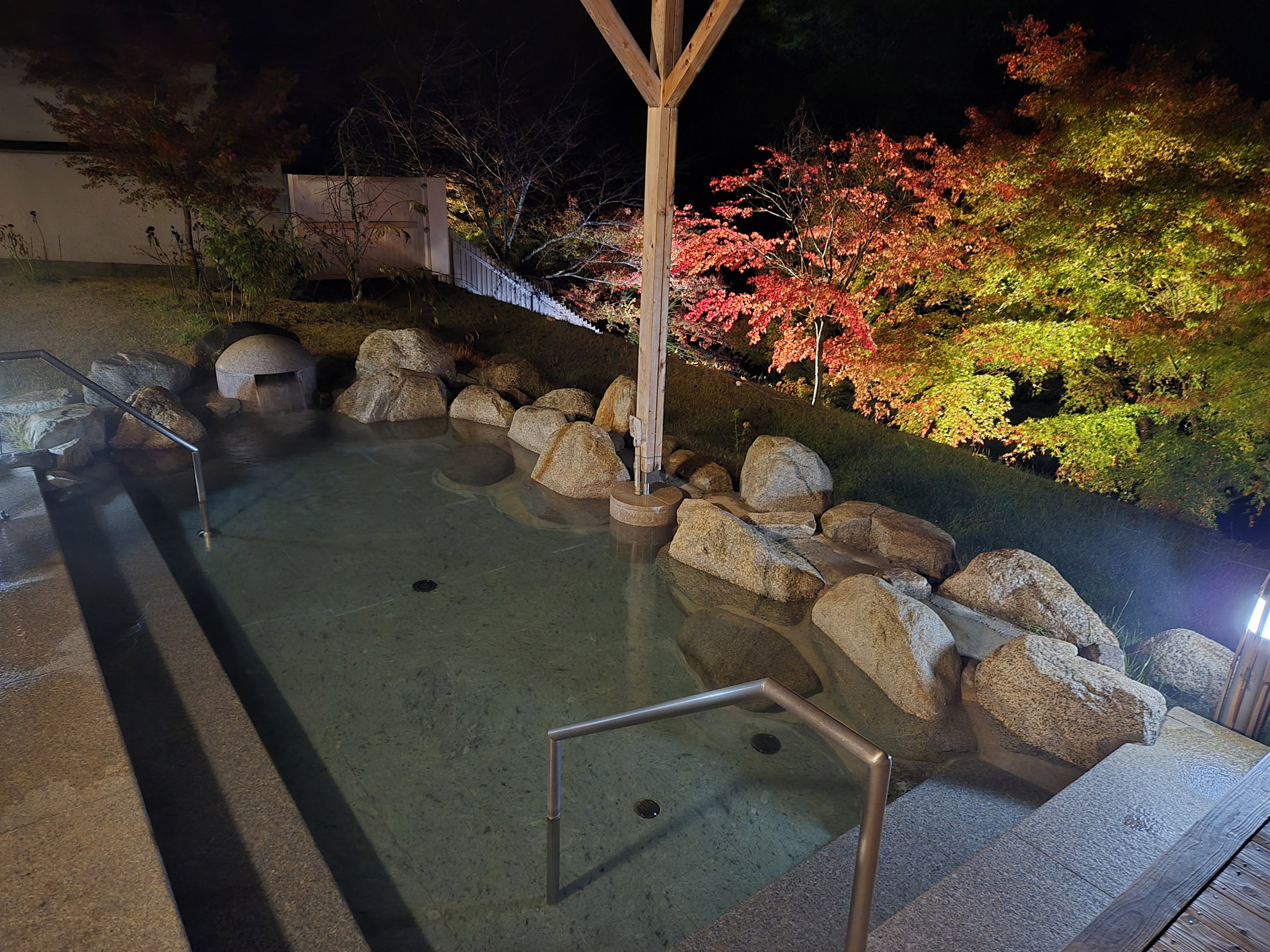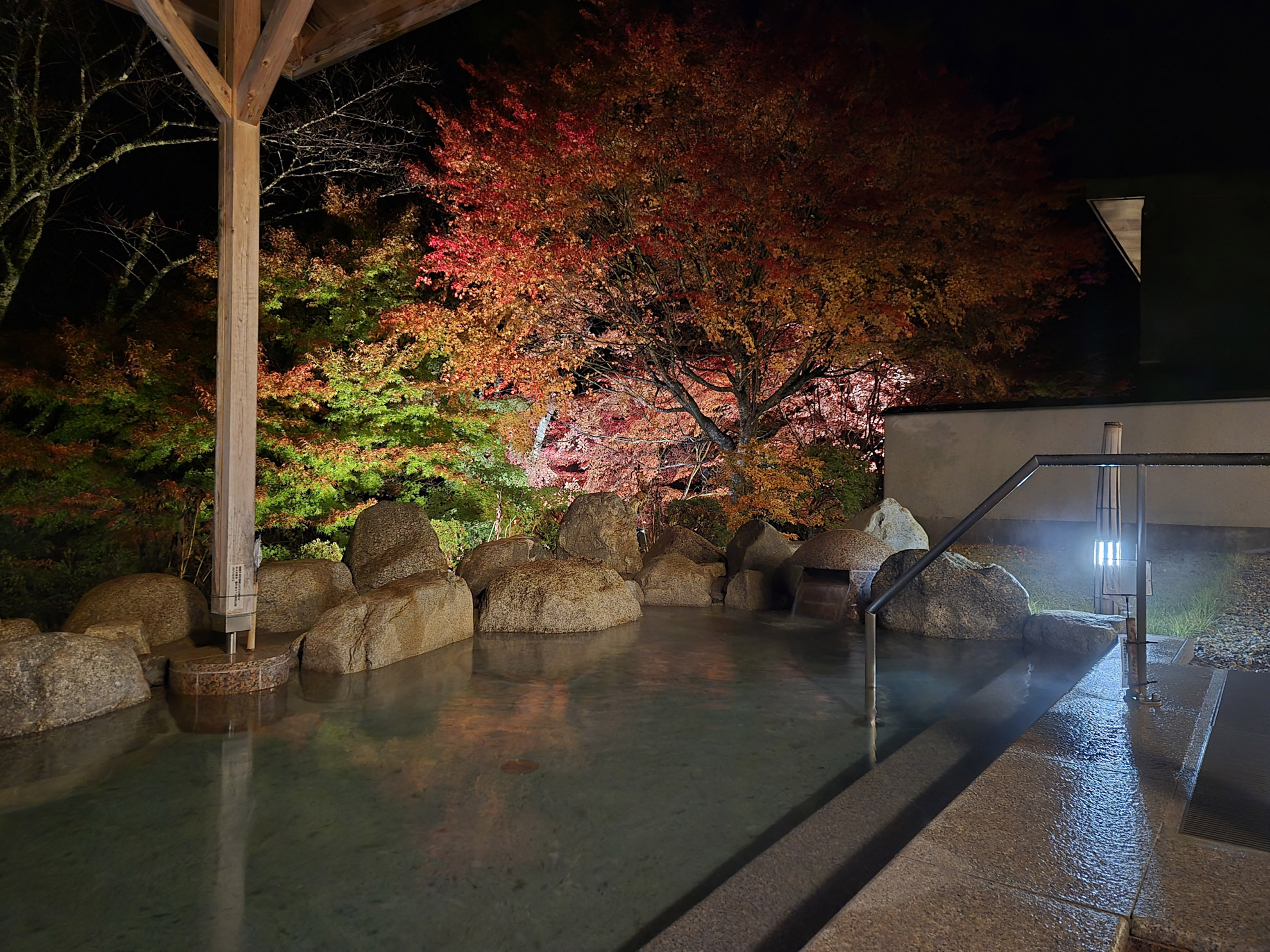 今回は、おきよめの湯の露天風呂の紅葉のライトアップの様子を11月9日に撮影しましたので掲載いたします。