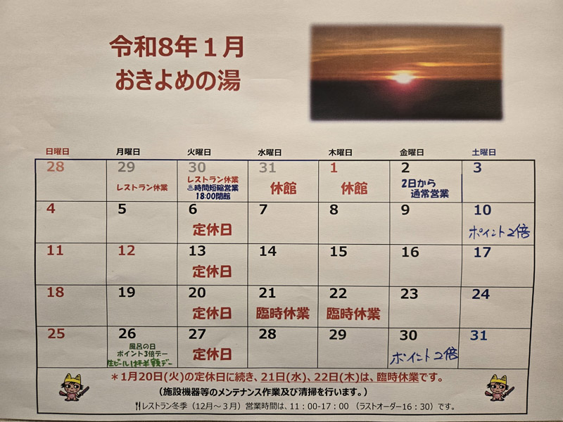 また、1月から3月までの期間限定で、10・20・30日はおきよめの湯ポイントカードのポイントが通常の1個に追加でもう1個貯まる「ポイン2倍デー」となります。(定休日の場合は順延なし)